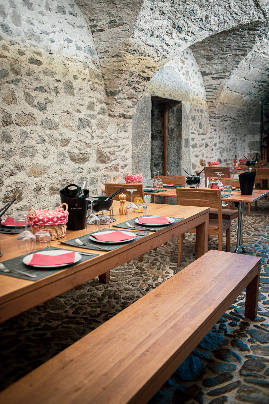 L’Hotel dispone di un ristorante interno per pranzi e cene con una proposta di piatti tipici della tradizione svizzera e italiana, e di una cantina in pietra dove è possibile organizzare degustazioni di vino, prodotti tipici locali, raclette, fondue chinoise e fondue di formaggi in un atmosfera esclusiva.